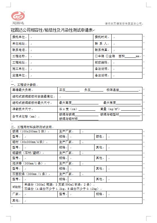 如客戶確定采用本公司系列產(chǎn)品時,請協(xié)助我們做好以下幾項工作:以最快的方式將工程所選用的基材(玻璃/鋁材或復(fù)合板)、輔助材料(雙面膠條和泡沫棒)、節(jié)點設(shè)計圖紙和相容性申請 表格寄送到我公司客服部或質(zhì)檢部,我們將按有關(guān)標(biāo)準(zhǔn)要求進(jìn)行粘結(jié)性、相容性試驗。